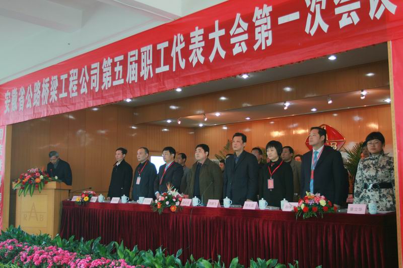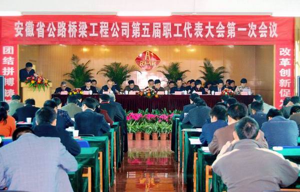 8:45,在莊嚴的國歌聲中,第五屆職工代表大會第一次會議正式開幕。公司總經理汪衛東向大會作了題為《統一思想 堅定信心 為實現安徽路橋的新崛起而奮斗》的工作報告。汪總在報告中指出,這次會議,是在當前國家擴大內需、加大基礎設施建設的特殊環境下,是在集團公司對當前經濟形勢科學研判和正確部署下,是在路橋公司謀求新崛起的關鍵時刻召開的一次十分重要的會議。