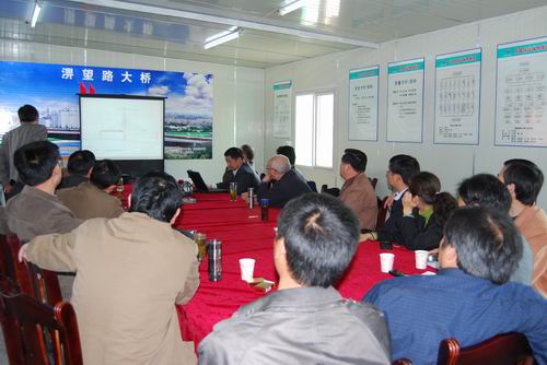 下午,觀摩團一行又驅車來到了金桃橋項目。參觀了現場后,在金寨縣賓館會議室觀摩團一行聽取了項目經理劉曉晗的匯報。隨后各單位技術負責人就項目的箱拱吊裝施工等關鍵技術作了討論和交流。鄭總對該橋目前進展情況表示滿意,并做了總結講話。同時對項目部積極探索和鉆研技術難點的精神表示贊賞。并對公司的質量技術管理工作提出要求,要求格式進一步結合深入學習實踐科學發展觀,繼續開展技術的開發挖掘,進行技術的集成創新,研究、提煉項目工法和專利,為集團公司技術創新多做工作,以增強集團公司的核心競爭力。