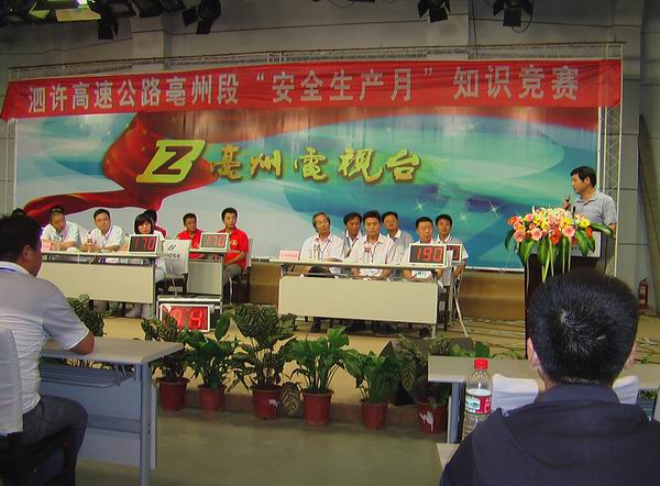 6月12日下午,在亳州市電視臺七樓演播廳舉辦了泗許高速亳州段“安全生產(chǎn)月”知識競賽,此次競賽由泗許高速亳州段建設(shè)辦舉辦,監(jiān)理單位和各施工單位共六支隊(duì)伍參加了比賽。亳州市質(zhì)量安全監(jiān)督局副局長程權(quán),泗許高速亳州段建設(shè)辦工程部部長蔡兵出席競賽并擔(dān)任競賽評委。